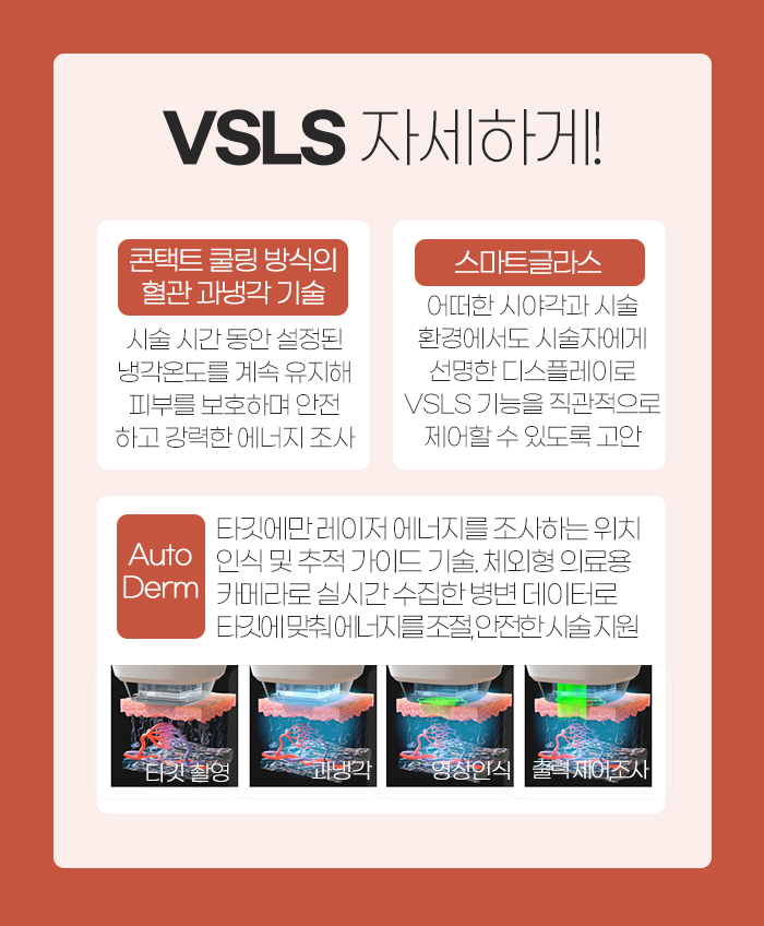 또 어떤 시야각과 시술 환경에서도 시술자에게 선명한 디스플레이로 VSLS 기능을 직관적으로 제어할 수 있게 고안되어 있습니다. 그리고 타깃에만 레이저 에너지를 조사하는 위치 인식 및 추적 가이드 기술을 갖추고 있는데요. 실시간 수집한 병변 데이터를 토대로 타깃에 맞춰 에너지를 조절하는 만큼 안전한 시술을 지원합니다.