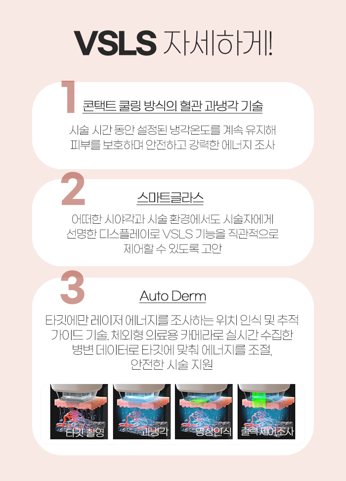 타깃에만 레이저 에너지를 조사하는 위치 인식 및 추적가이드 기술을 사용하고 있기 때문에 체외형 의료용 카메라로 실시간 수집된 병변 데이터로 타깃에 맞춰 에너지를 조절합니다. 그래서 안전한 시술을 지원하고 있답니다.