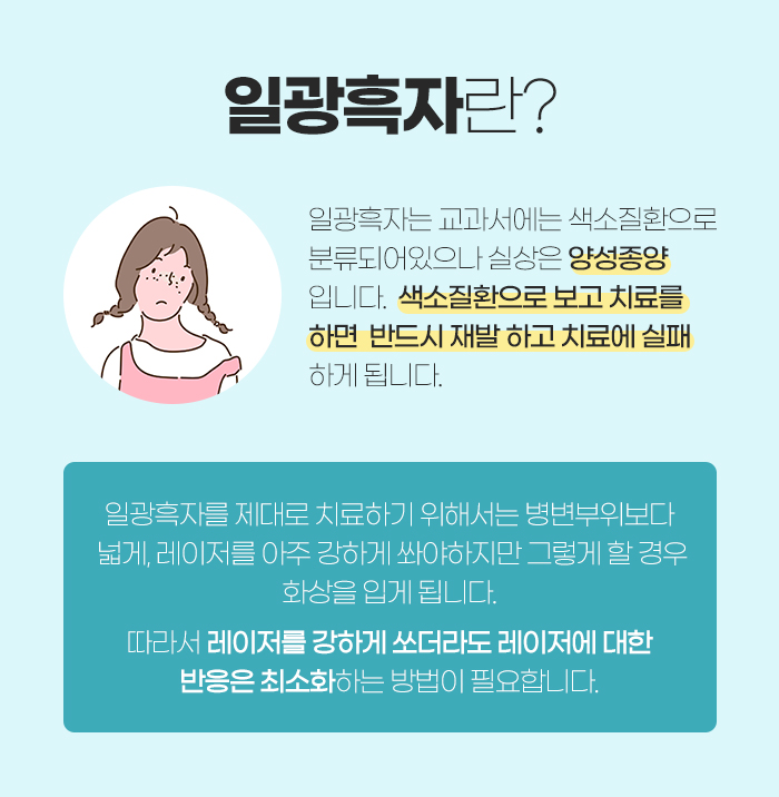 흑자에 대해 설명부터 하자면 교과서에 색소 질환으로 나와 있지만 사실 양성 종양이기 때문에 색소 질환으로 보면서 치료를 하게 될 경우 반드시 재발하게 되면서 치료에 실패하게 된답니다. 그리고 흑자를 제대로 치료하려 한다면 병변 부위보다 레이저를 넓게, 아주 강하게 쏘아야 하는데요. 하지만 레이저를 강하게 쏘게 되면 화상을 입게 되기 때문에 레이저를 강하게 쏘기도 해야 하지만 레이저에 대한 반응을 최소화시키도록 해야 합니다.