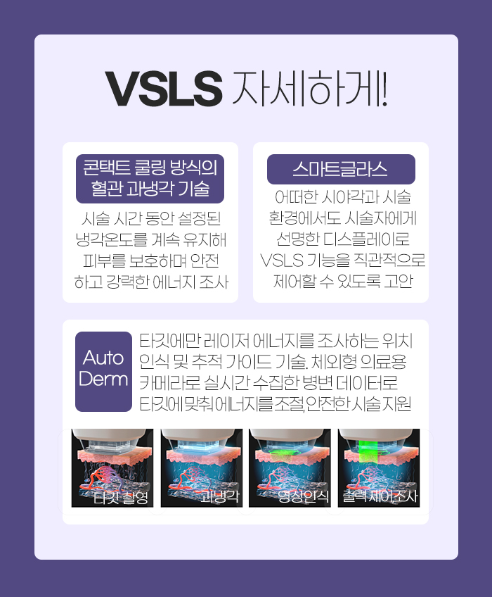 또 어떤 시야각과 시술 환경에서도 시술자에게 선명한 디스플레이로 VSLS 기능을 직관적으로 제어할 수 있게 고안되어 있는데요. 타깃에만 레이저 에너지를 조사하는 위치 인식 및 추적 가이드 기술인 만큼 체외형 의료용 카메라로 실시간 병변 데이터를 수집하면서 타깃에 맞춰 에너지를 조절한답니다. 그래서 안전한 시술을 지원합니다.