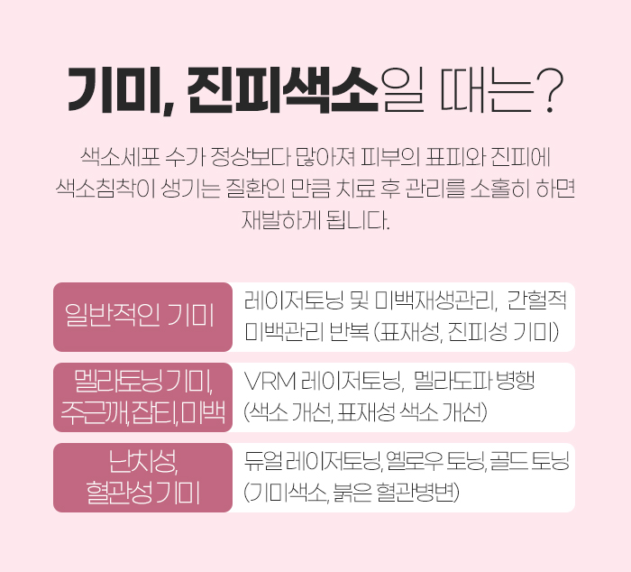 그리고 삼송동 흑자가 아닌 기미나 진피색소 같은 색소 질환인 경우에는 VSLS 리팟을 통해 치료를 하는데 도움을 받기 어렵습니다. 그 이유는 병변 부위에 있는 이상 세포를 제거하는 것으로 치료를 진행하기에 적합하지 않기 때문인데요.