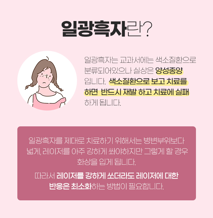 이러한 흑자를 제대로 치료하는데 도움을 받고자 한다면 병변 부위보다 레이저를 넓게, 아주 강하게 쏘아야 합니다. 하지만 그럴 경우에는 화상을 입게 되기 때문에 레이저를 강하게 쏘는 것도 중요하지만 레이저에 대한 반응을 최소화시키도록 해야 합니다.