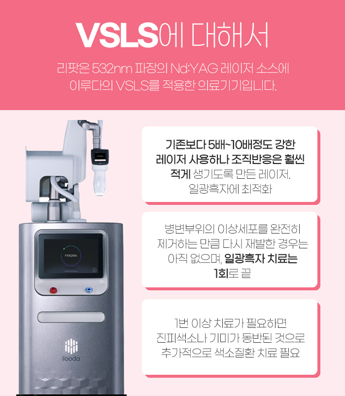 또 기미나 진피색소는 VSLS 리팟으로 치료를 진행하기 어렵습니다. 이는 색소 세포의 수가 정상보다 많아지면서 피부의 표피와 진피에 색소 침착이 생기게 되는 질환이기 때문입니다. 이런 경우 양성 종양처럼 이상 세포를 제거하는 방식으로 치료를 진행하기보다는 피부 세포 속에 있는 멜라닌 색소를 세포 손상 없이 파괴하는 방법으로 치료를 진행하도록 해야 합니다.