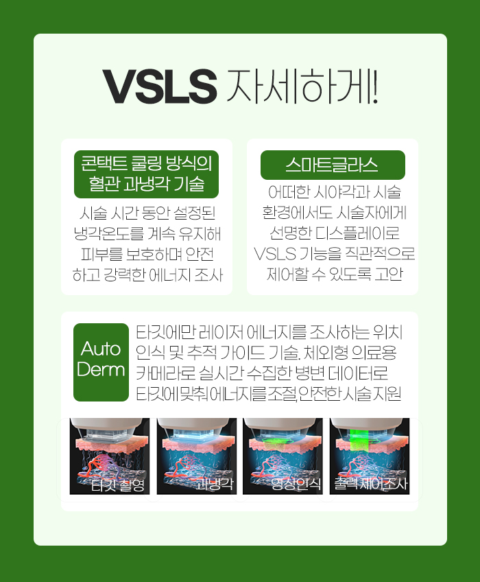 혈관 과냉각 기술은 시술을 받는 동안 설정되어 있는 냉각 온도를 계속 유지해서 피부를 보호하면서도 안전하고 강력하게 에너지를 조사한답니다. 그리고 스마트 글라스는 어떤 시야각과 시술 환경에서도 시술자에게 선명한 디스플레이를 통해 직관적으로 VSLS 기능을 제어할 수 있도록 고안되어 있습니다.