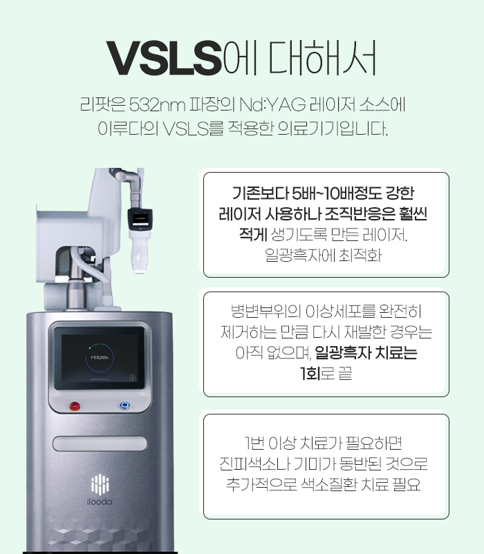 그리고 증산동 리팟레이저는 532nm 파장의 엔디야그 레이저 소스에 이루다의 VSLS를 적용한 의료기기를 말한답니다. 기존보다 5배에서 10배 정도 강한 레이저를 사용하고 있는데요. 그러면서도 조직 반응이 훨씬 적게 생기도록 만들어졌답니다. 그래서 흑자에 가장 적합한 기기라고 말씀드릴 수 있습니다.