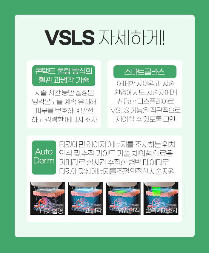 혈관 과냉각 기술은 시술을 받는 동안 설정되어 있는 냉각 온도를 계속 유지해서 피부를 보호하고 안전하고 강력하게 에너지를 조사하기 때문이랍니다. 또 스마트 글라스는 어떤 시야각과 시술 환경에서도 시술자에게 선명한 디스플레이로 VSLS 기능을 직관적으로 제어할 수 있게 고안되어 있습니다.