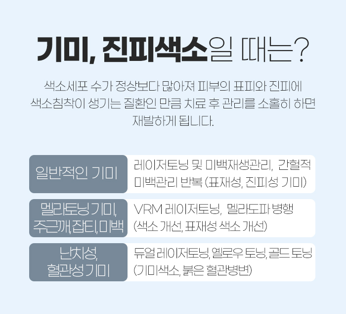 하지만 기미나 진피색소 같은 색소 질환은 피부 세포 속에 있는 멜라닌 색소를 세포 손상 없이 파괴하여 제거하는 방법으로 도움을 받아야 하는데요. 그 이유는 색소 세포 수가 정상보다 많아지면서 피부의 표피와 진피에 색소 침착이 생기게 된 것이기 때문입니다. 더욱이 치료를 받고 난 후 다시 재발할 수 있기 때문에 관리 역시 꼼꼼하게 해야 한답니다.