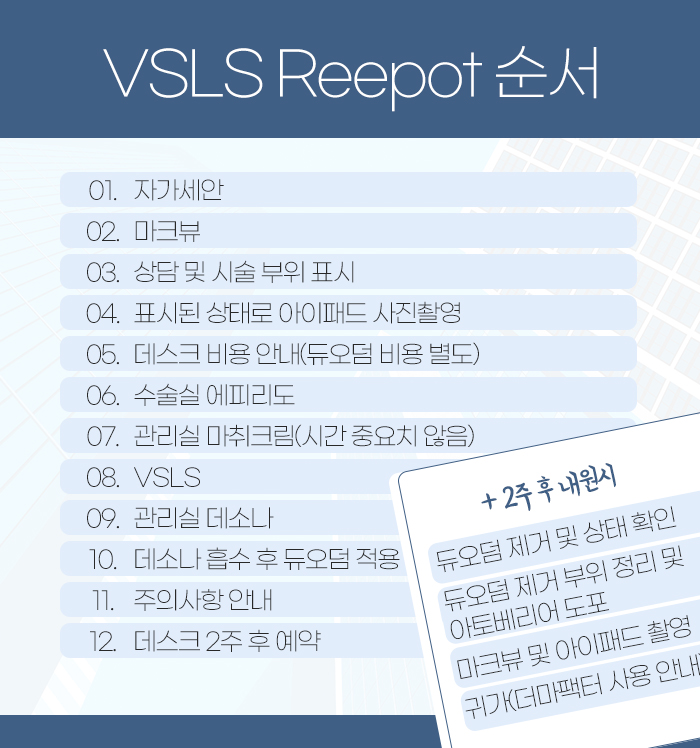 VSLS 리팟을 시술받게 될 때는 먼저 세안을 하게 된 다음 마크뷰를 합니다. 그리고 상담을 하고 나서 시술받을 부위를 표시하게 되는데요. 이렇게 표시가 된 상태로 아이패드를 이용해 사진을 촬영합니다. 또 수술실에서 에피리도를 하고 관리실에서 마취크림을 바르게 되는데요.