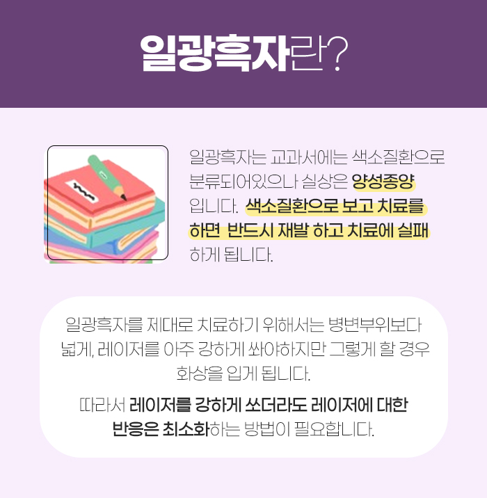먼저 흑자에 대해 이야기하자면 교과서에 색소 질환으로 분류되어 있긴 하지만 사실 색소 질환이 아니랍니다. 양성 종양인데요. 그래서 색소 질환으로 생각하고 치료를 진행하게 될 경우 반드시 흑자가 재발하게 되면서 치료에 실패하게 된답니다.