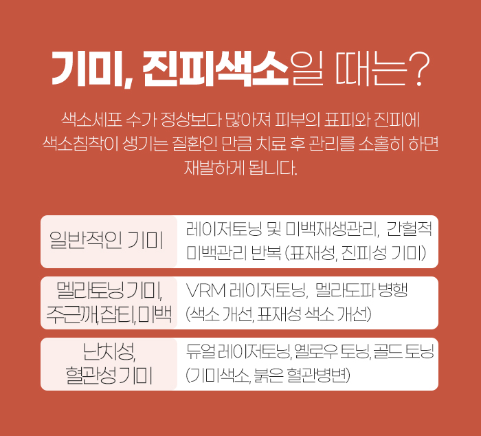그래서 이러한 색소 질환을 치료하는데 도움을 받으려 한다면 피부 세포 속에 있는 멜라닌 색소를 세포 손상 없이 파괴하여 제거하는 방법을 통해 도움을 받도록 해야 하는데요. 이로 인해 레이저 토닝을 통해 도움을 받으시는 경우가 많답니다.