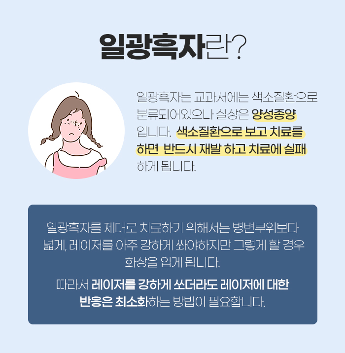 이러한 진관동 흑자가 다시 올라오는 일이 없도록 제대로 치료하는데 도움을 받고자 한다면 병변 부위보다 레이저를 넓게, 아주 강하게 쏘아야 합니다. 하지만 레이저를 강하게 쏘게 되면 화상을 입게 되는데요. 그래서 레이저를 강하게 쏘기도 해야 하지만 레이저에 대한 반응을 최소화시키도록 해야 합니다.