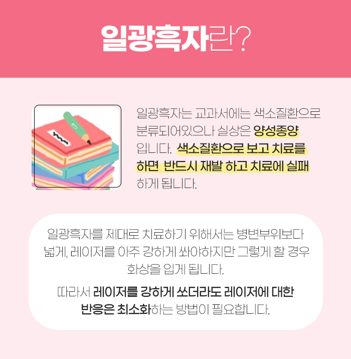그리고 증산동 흑자에 대해 설명해 보자면 교과서에는 색소 질환으로 분류되어 있지만 사실 색소 질환이 아닌 양성 종양이랍니다. 그래서 색소 질환으로 보고 치료를 진행하게 될 경우 반드시 재발하게 되면서 치료에 실패하게 되는 것은 말할 것도 없는데요.