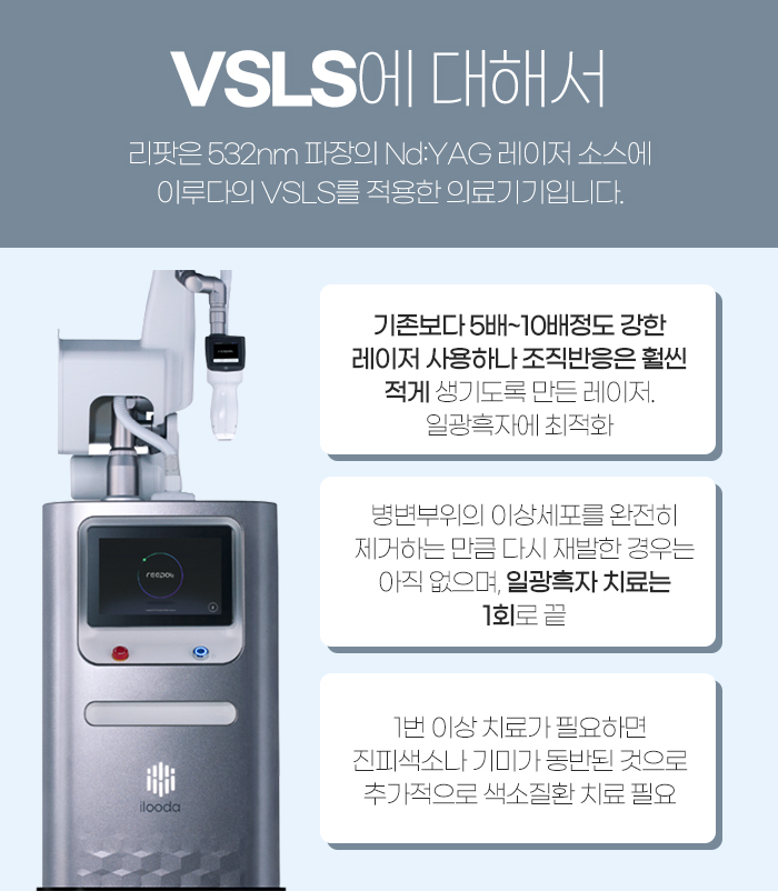 그렇기에 VSLS 리팟을 시술하게 되는 것인데요. 532nm 파장의 엔디야그 레이저 소스에 이루다의 VSLS를 적용한 의료기기이며, 기존보다 5~10배 정도 강한 레이저를 사용하고 있답니다. 그러면서도 조직 반응이 아주 적게 생기도록 만들어진 만큼 흑자에 가장 적합한 기기라고 말씀드릴 수 있는데요.
