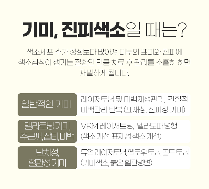그리고 기미나 진피색소 같은 경우에는 레이저 토닝이나 멜라도파 등의 방법이 적합한데요. 그도 그럴 것이 색소 세포 수가 정상보다 많아지면서 피부 표피와 진피에 색소 침착이 생긴 것이기 때문입니다. 그런 만큼 피부 세포 속에 있는 멜라닌 색소를 세포 손상 없이 파괴하여 제거하는 방법이 적합합니다. 덧붙여 이러한 색소 질환은 관리 또한 중요한데요. 관리를 소홀히 할 경우 다시 재발하는 문제가 생기기 때문입니다.