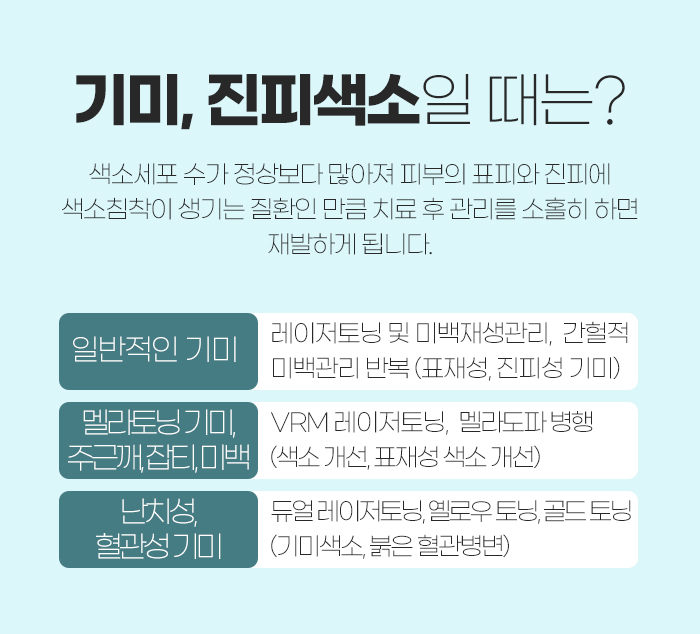 예를 들어 일반적인 기미라면 레이저 토닝, 미백 재생 관리, 간헐적 미백 관리를 반복하는 것을 통해 도움을 받을 수 있지만 멜라토닝 기미나 주끈깨, 잡티 등의 경우에는 VRM 레이저 토닝, 멜라도파를 병행하도록 해야 합니다.