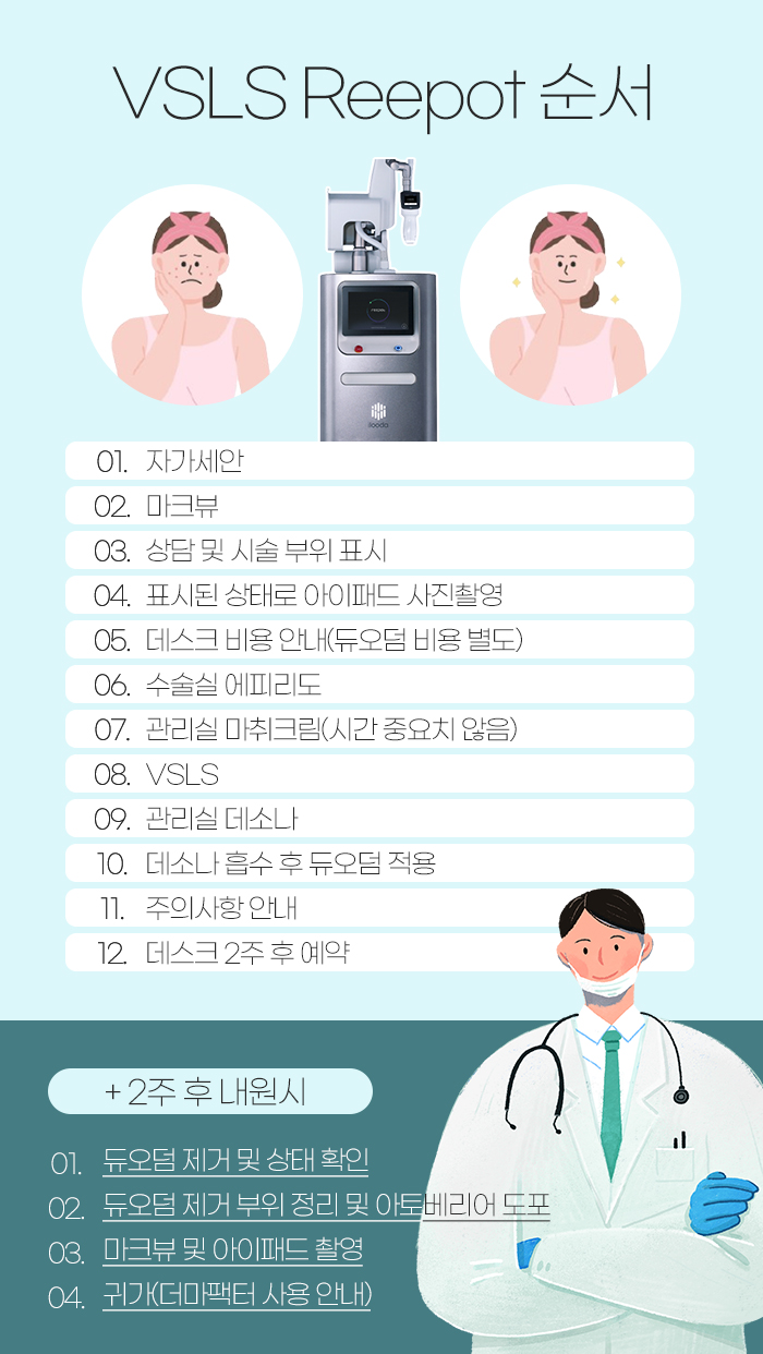 또한 VSLS 리팟을 시술하게 될 때는 먼저 세안을 하고 나서 마크뷰를 하게 되고 상담을 하고 나서 시술받을 부위를 표시하게 됩니다. 또 표시가 된 상태로 아이패드를 통해 사진을 촬영하고 수술실에서 에피리도를 하며 관리실에서 마취크림을 바른 다음 시술에 들어가게 되는데요.